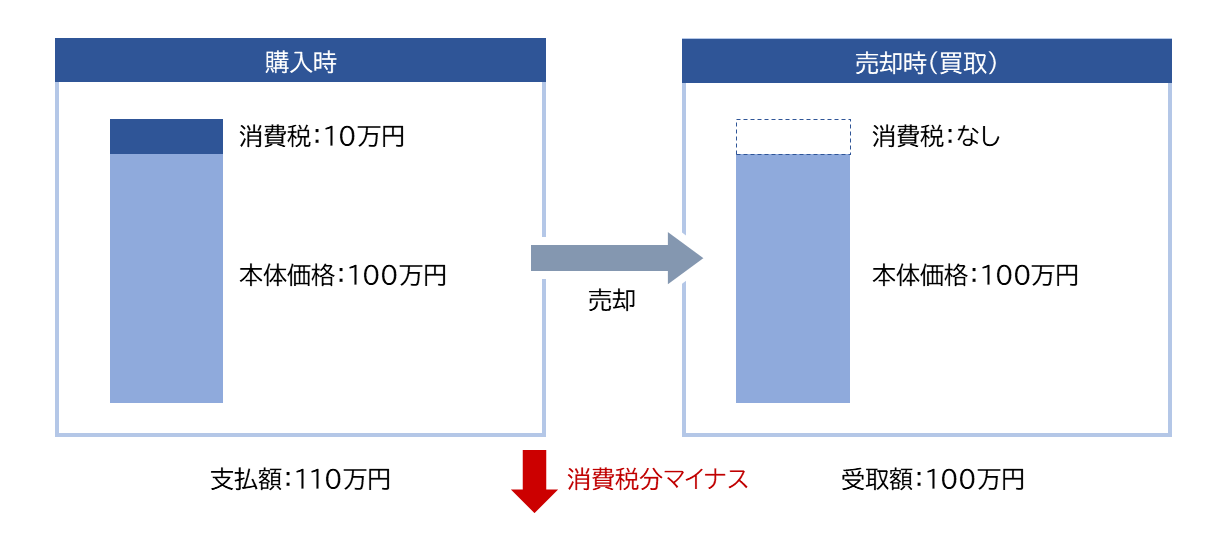 税抜き価格で100万円の時計を購入して、同じ価格で売却しても、キャッシュフローとしては消費税10%相当の10万円がマイナスとなります。